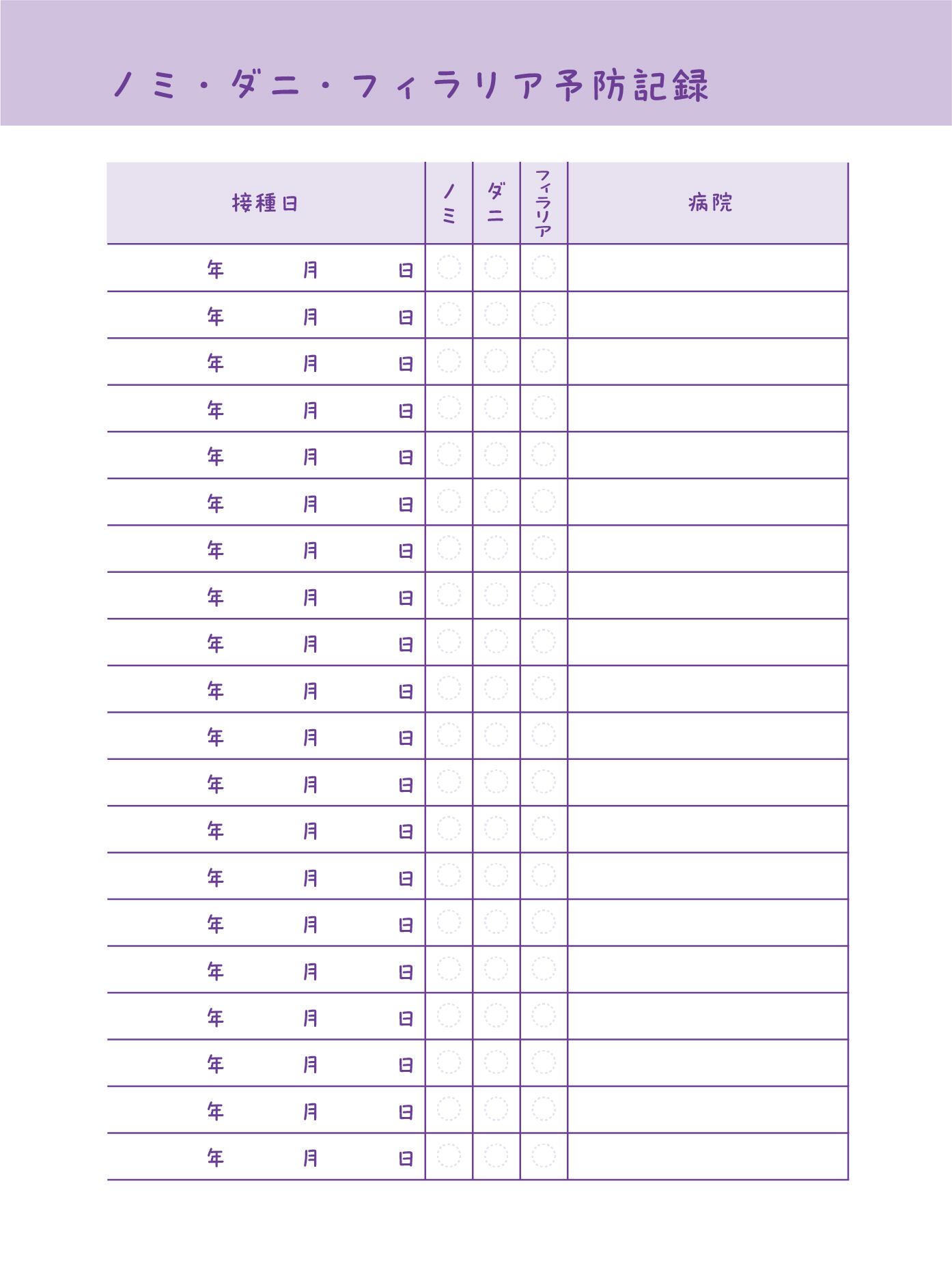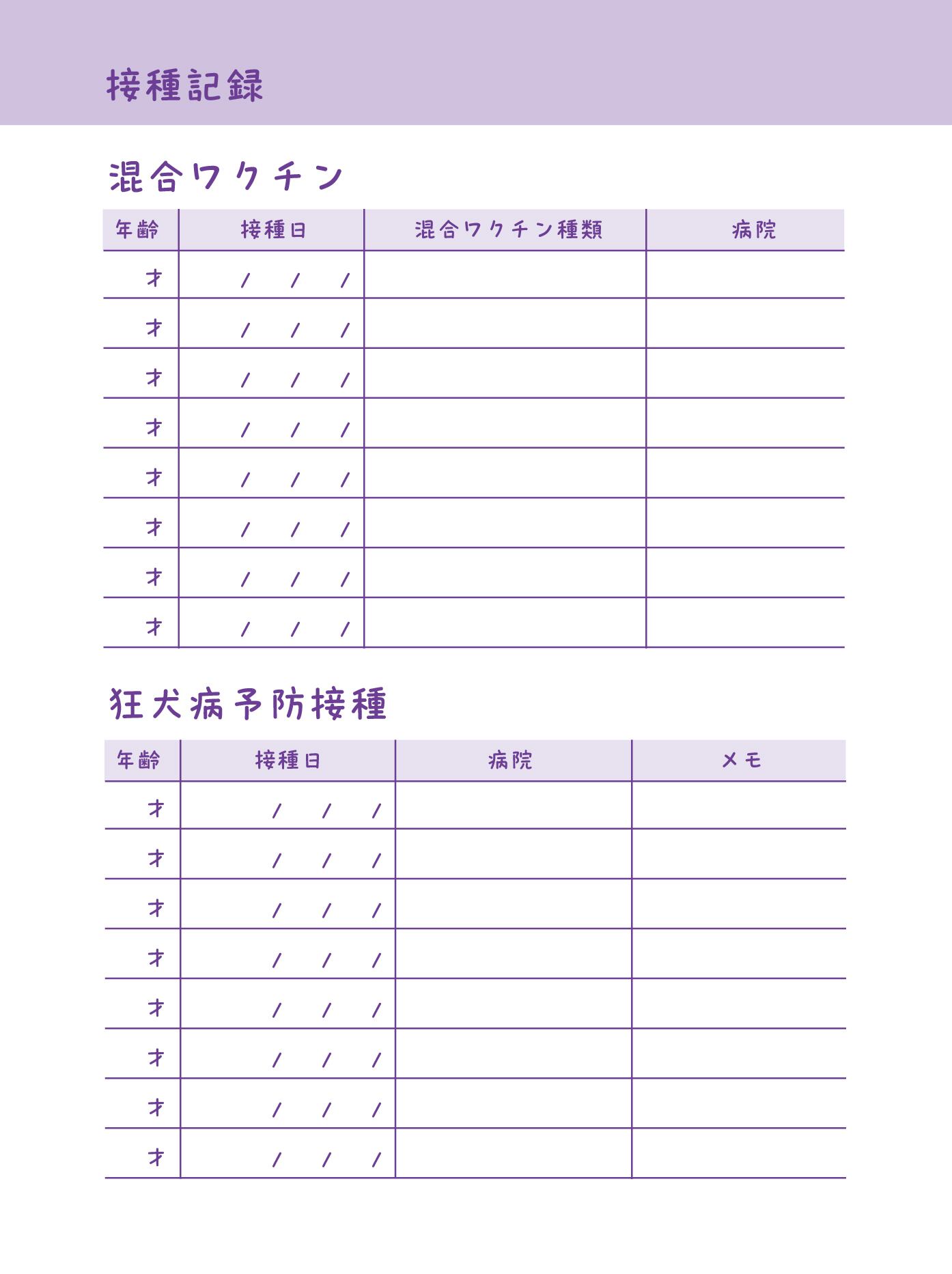 内容 受診記録、体重推移、トリミング記録、予防接種記録(ノミ・ダニ・フィラリア、混合ワクチン、狂犬病)、メモ